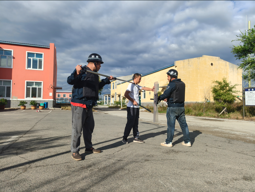 当日上午9时30分,演练正式启动。一名“可疑人员”在公司大门外徘徊观察后,突然持械冲击门岗,企图强行闯入厂区。值班安保人员第一时间察觉异常,立即上前予以制止并当场发出严厉警告。在“不法分子”拒不配合且持续冲击门岗的紧急态势下,公司安保团队迅速启动防暴应急预案。安保队长沉着部署指挥:一组人员手持防暴盾牌、钢叉与“不法分子 形成有效对峙周旋;二组人员快速疏散周边作业员工,同步完成现场封锁管控;三组人员立即拨打报警电话,并第一时间向公司应急指挥部上报情况。整个处置过程规范高效,全体员工均安全撤离,未发生任何人员伤亡。最终,安保人员成功将“不法分子”制服,并移交随后抵达的公安机关依法处置。